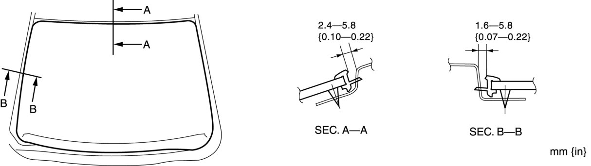 13. Verify that the clearance between the A-pillar and the roof is within the range shown in the figure, and press along the perimeter of the glass.