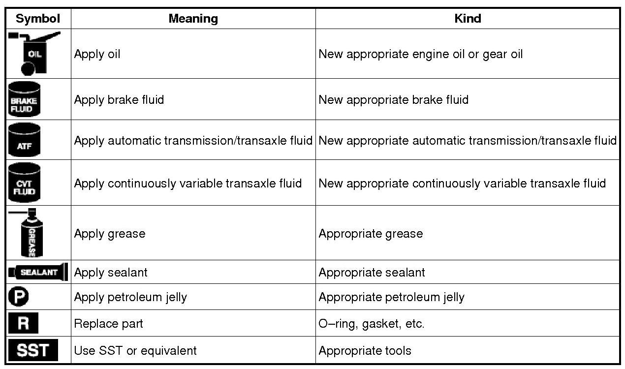- There are nine symbols indicating oil, grease, fluids, sealant, and the use of SST or equivalent. These symbols show application points or use of these materials during service.