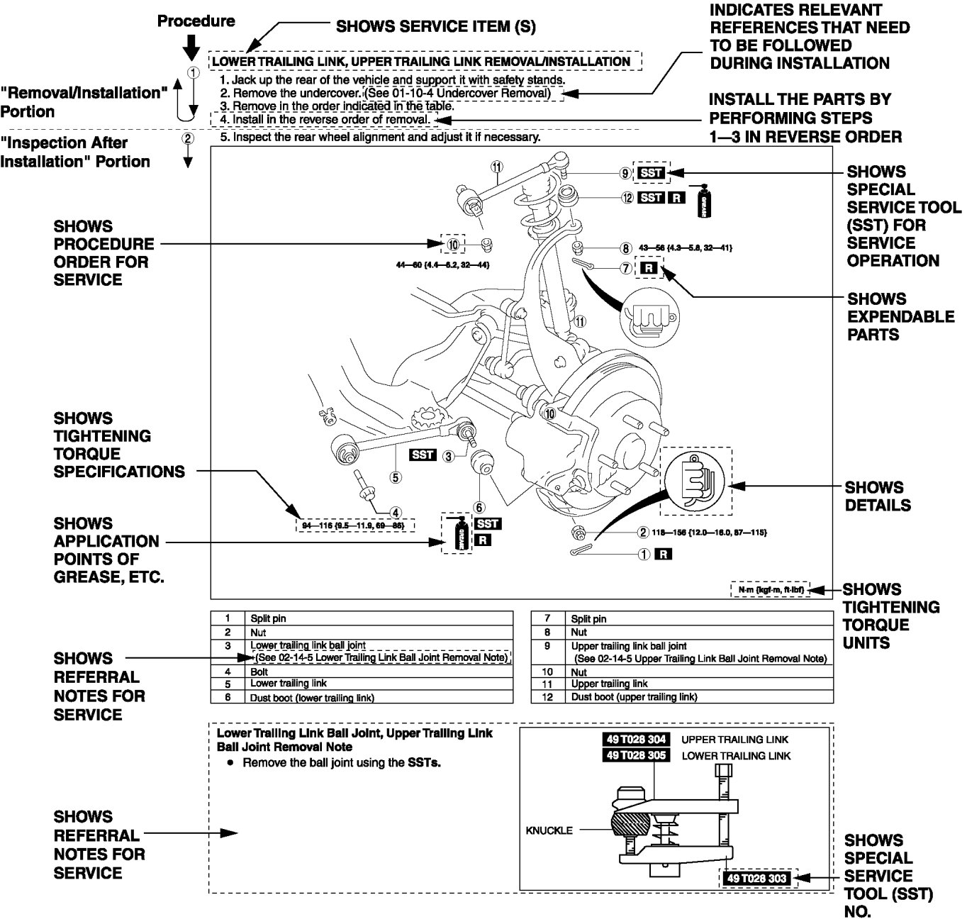 - Inspection and adjustment procedures are divided into steps. Important points regarding the location and contents of the procedures are explained in detail and shown in the illustrations.