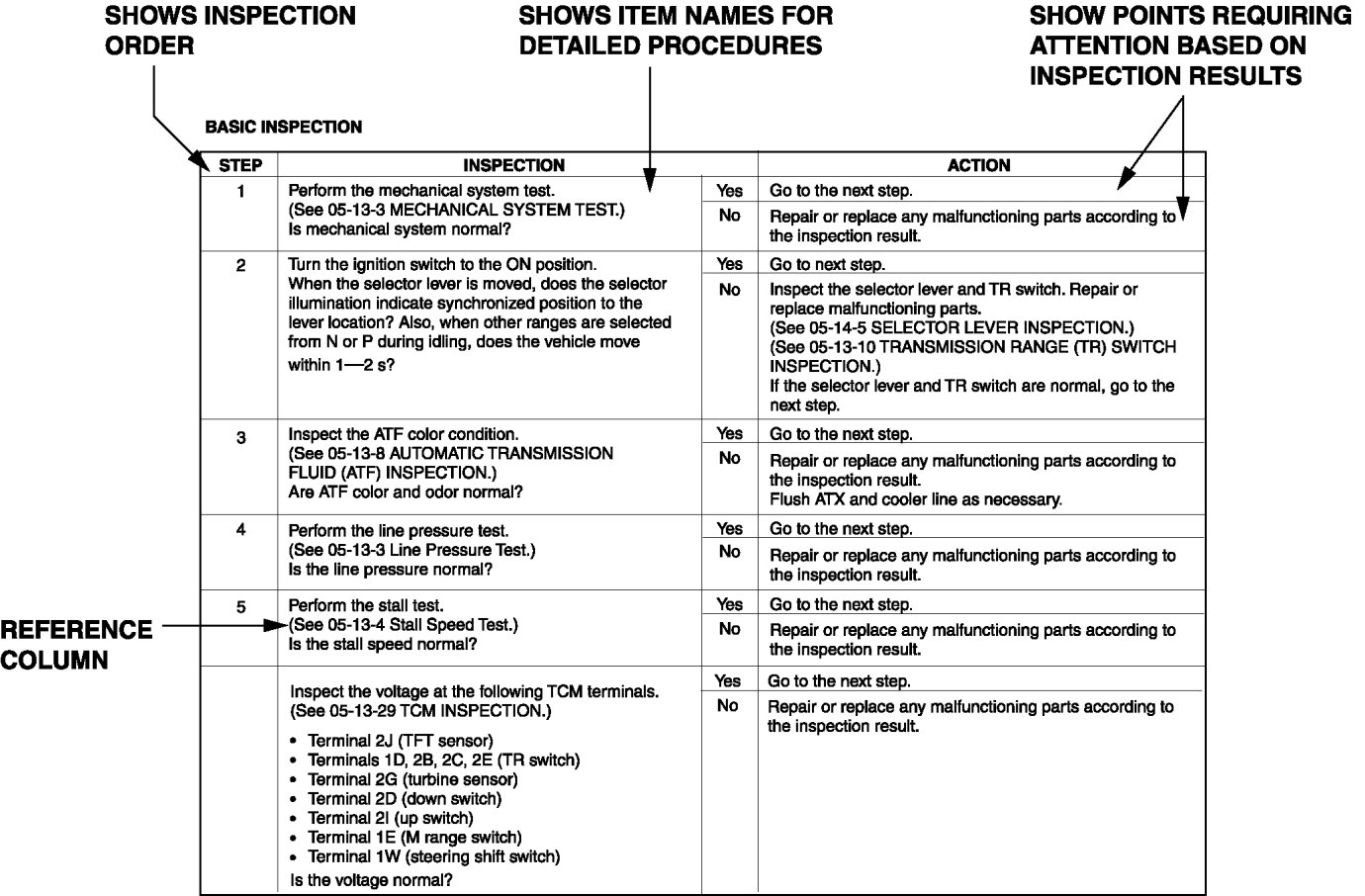 - Although inspections and adjustments are performed according to the reference column procedures, if the cause of the malfunction is discovered during basic inspection, continue the procedures as indicated in the action column.