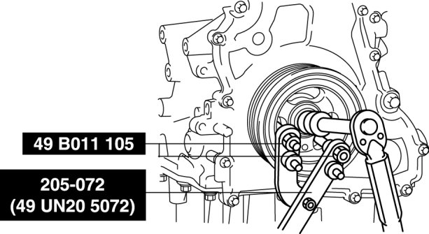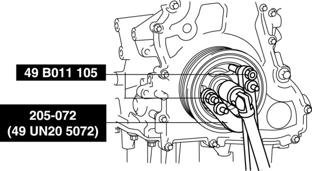 3. To position the crankshaft pulley, temporarily tighten it and, using a suitable bolt (M6 X 1.0), fix the crankshaft pulley to the engine front cover.
