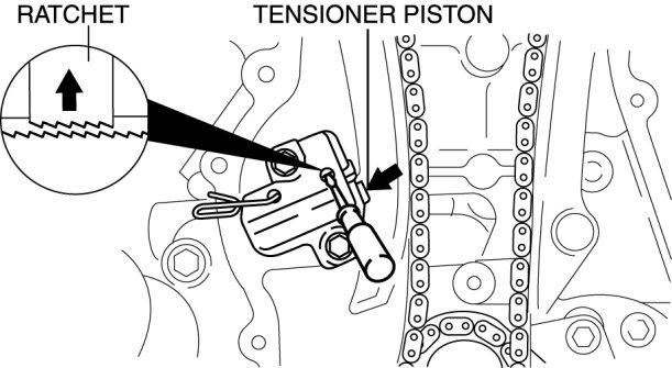 1. Using a thin screwdriver, hold the chain tensioner ratchet lock mechanism away from the ratchet stem.