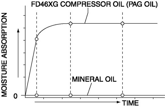 - FD46XG compressor oil (PAG oil) has a higher moisture absorption efficiency than the previously used mineral oil. If moisture mixes with the compressor oil, the refrigerant system could be damaged. Therefore, install caps immediately after using the compressor oil or removing refrigerant system parts to prevent moisture absorption.