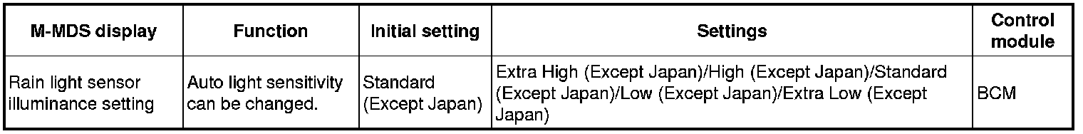 - If the mode is set to "Extra High (Except Japan)" and "High (Except Japan)", the illumination level for illuminating the TNS and headlight increases. Therefore, the TNS and headlights illuminate when the ambient light is brighter than when the level is set to "Standard (Except Japan)". In addition, if the mode is set to "Low (Except Japan)" and "Extra Low (Except Japan)", the illumination level for illuminating the TNS and headlights decreases. Therefore, the TNS and headlights illuminate when the ambient light is lower than when the level is set to "Standard (Except Japan)".