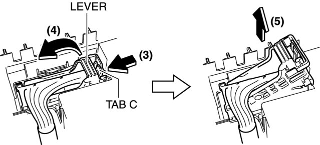 3. With tab C pressed in the direction of the arrow (3), disconnect the relay and fuse block connector in the direction of the arrow (5) while raising the lever in the direction of the arrow (4) as shown in the figure.