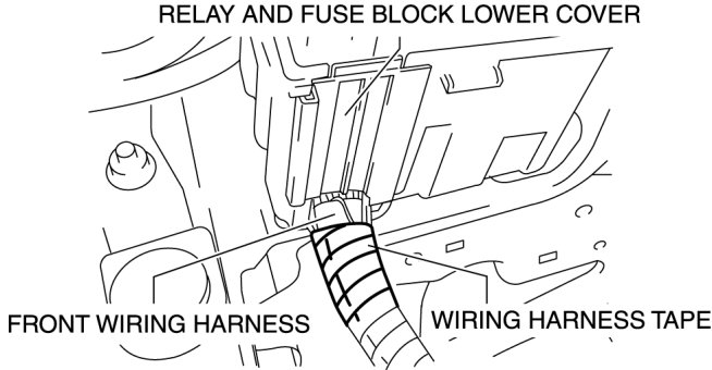 6. Remove the relay and fuse block lower cover and the wiring harness tape securing the front wiring harness.