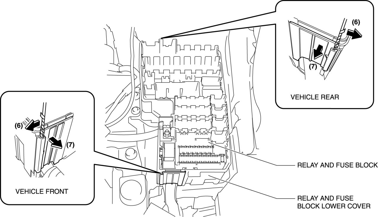 - Detaching tab B without detaching hook A could damage the relay and fuse block cover. When removing the relay and fuse block cover, always detach hook A first.