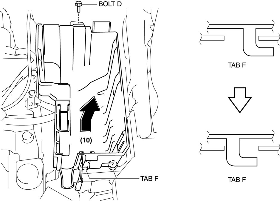 14. Remove tab F from the wheel apron panel (front), and remove the relay and fuse block lower cover in the direction of the arrow (10) shown in the figure.
