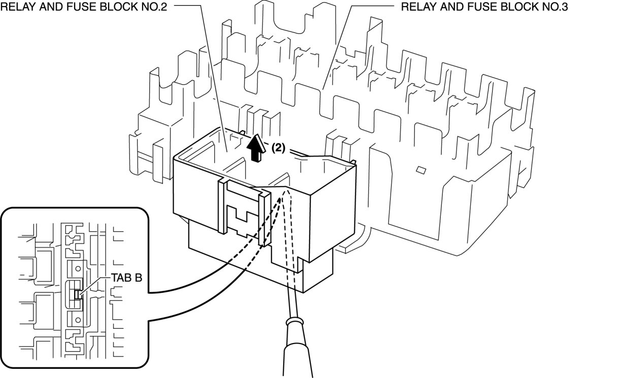 2. Remove relay and fuse block No. 2 from relay and fuse block No.3 in the direction of the arrow (2) shown in the figure with tab B of relay and fuse block No.2 released.