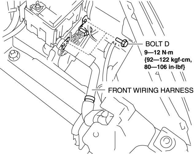 13. Install securing bolt D with the ground wire branching from the front wiring harness.