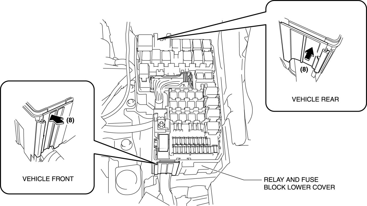 19. Close the cover of the relay and fuse block lower cover in the direction of the arrow (8) shown in the figure.