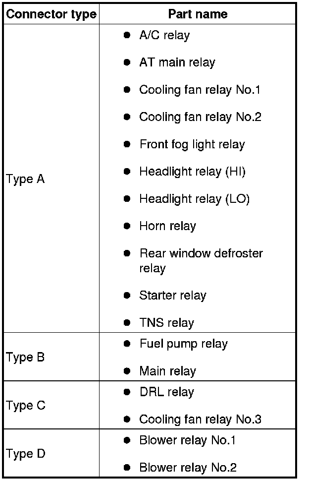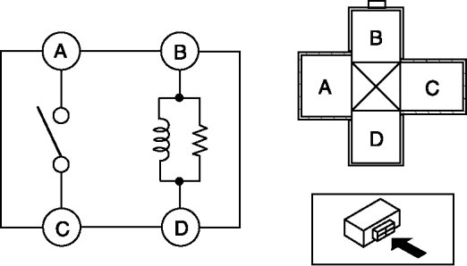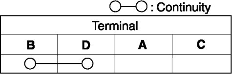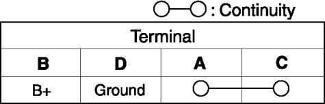 b. Apply battery positive voltage to terminal B, and connect terminal D to ground. Verify that the continuity between terminals A and C.