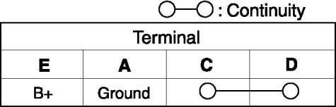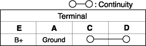 c. Apply battery positive voltage to terminal E, and connect terminal A to ground. Verify that the continuity between terminals C and D.
