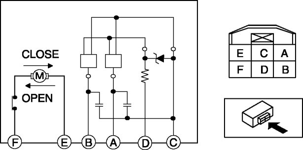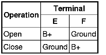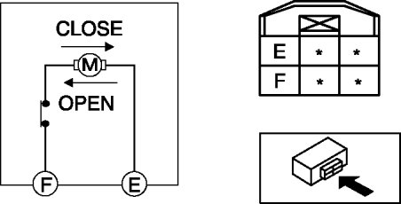 3. Apply battery positive voltage and connect the ground to the driver-side power window motor terminals E and F, and then inspect the driver-side power window motor operation.