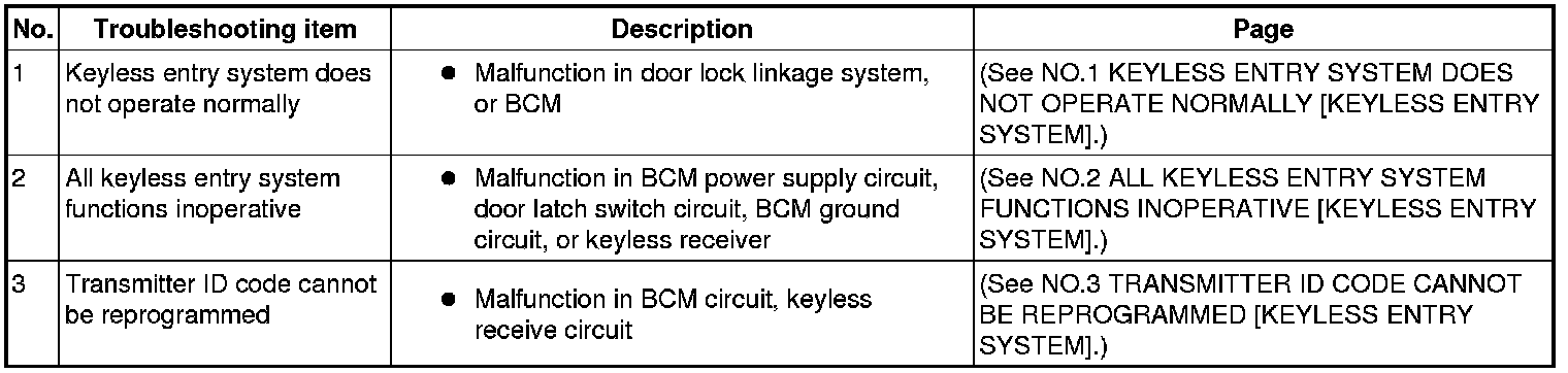 SYMPTOM TROUBLESHOOTING CHART [KEYLESS ENTRY SYSTEM]