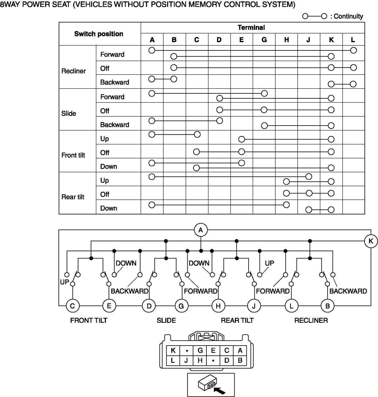 2. Inspect for continuity between the power seat switch connector terminals using an ohmmeter.