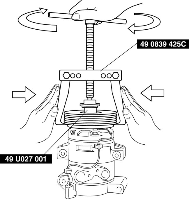 - If the SST is not properly positioned when the A/C compressor pulley is press-fit, the A/C compressor axle will interfere with the SST, possibly damaging component parts. Verify the SST and axle are properly positioned and perform the procedure very carefully.