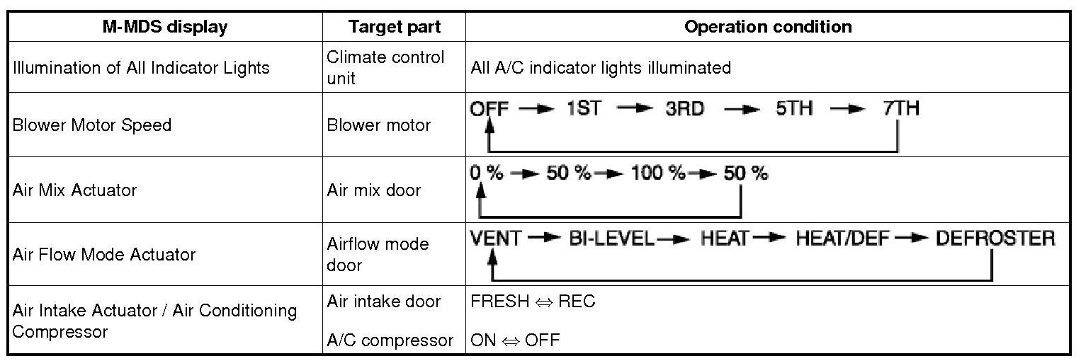 A/C Operation Check Mode Table