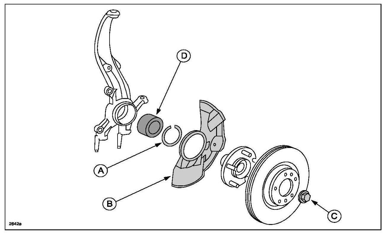 Be sure to replace the retaining clip (A), dust cover (B) and locknut (C) with new ones during wheel bearing (D) replacement.