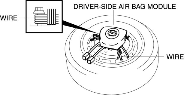 3. Place the driver-side air bag module on the center of the tire wheel with the padded surface facing up. To secure the air bag module to the tire wheel, wrap a wire (cross section 1.25 mm2 {0.002 in2} or more) through the wheel and the bolt installation holes of the air bag module at least 4 times.