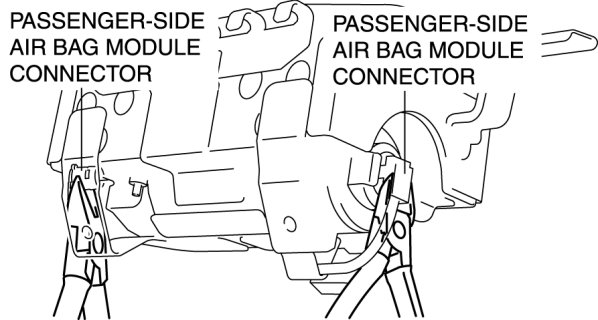 - The passenger-side air bag module is a dual inflator type. If one inflator is forced to operate (deploy), the other may operate (deploy) accidentally. To prevent injury while disposing of the air bag module, make sure to operate (deploy) both passenger-side air bag module inflators simultaneously, following the procedure below.