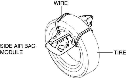 5. Put the side air bag module inside the tire and secure it to the tire by wrapping a wire (cross section of 1.25mm2 {0.002in2} or more) through the tire and the bolt installation holes at least 4 times.