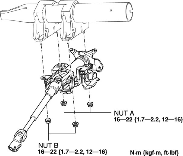 2. Temporarily install the steering shaft component to the dashboard member using nuts A and B.