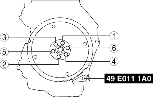 2. Loosen the drive plate installation bolts uniformly in two or three steps in the order shown in the figure, then remove the bolts and the drive plate.