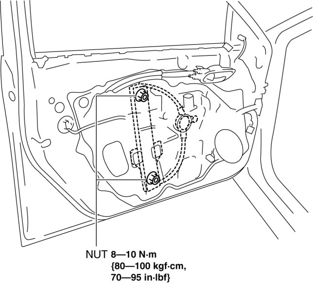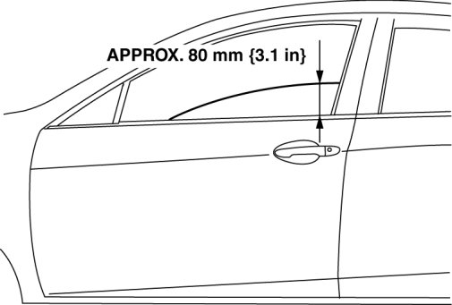 1. To access the glass installation bolt, position the front door glass so that the distance from the top of the front door glass to the upper part of the front beltline molding is approx. 80 mm {3.1 in}.