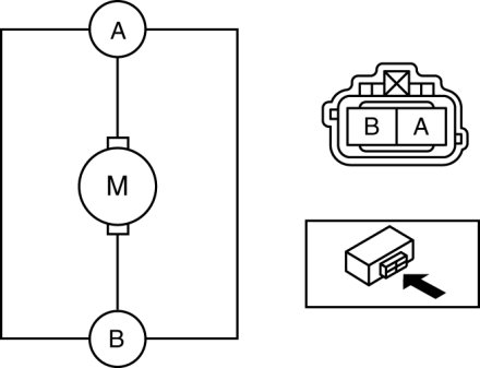 4. After connecting washer motor terminal A to the positive battery terminal, and terminal B to the negative battery terminal, verify that washer fluid flows to the windshield washer hose.