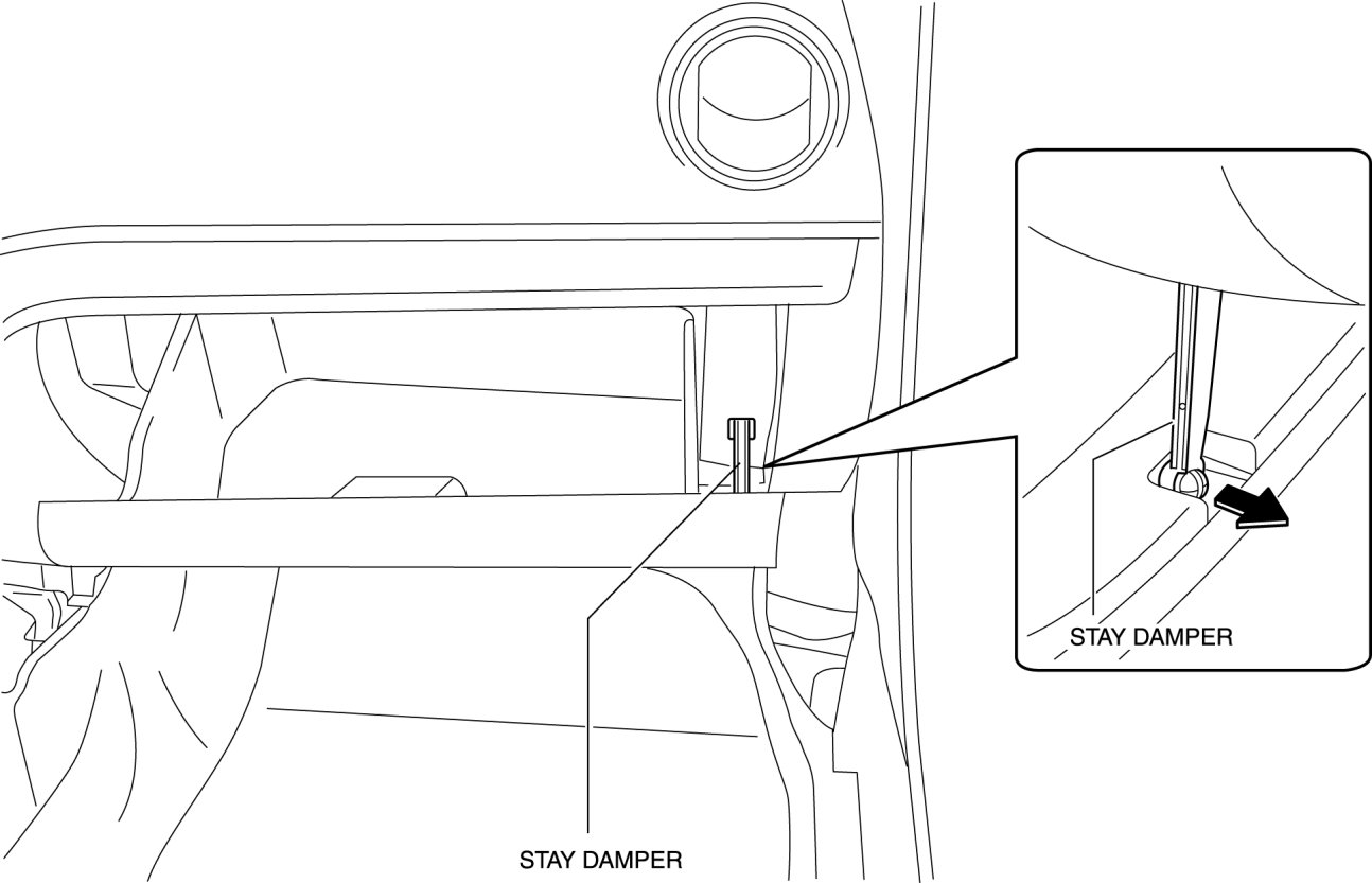 - If the glove compartment is closed without being joined to the stay damper, the stay damper may be damaged. Verify that the stay damper is joined to the glove compartment before closing the glove compartment.