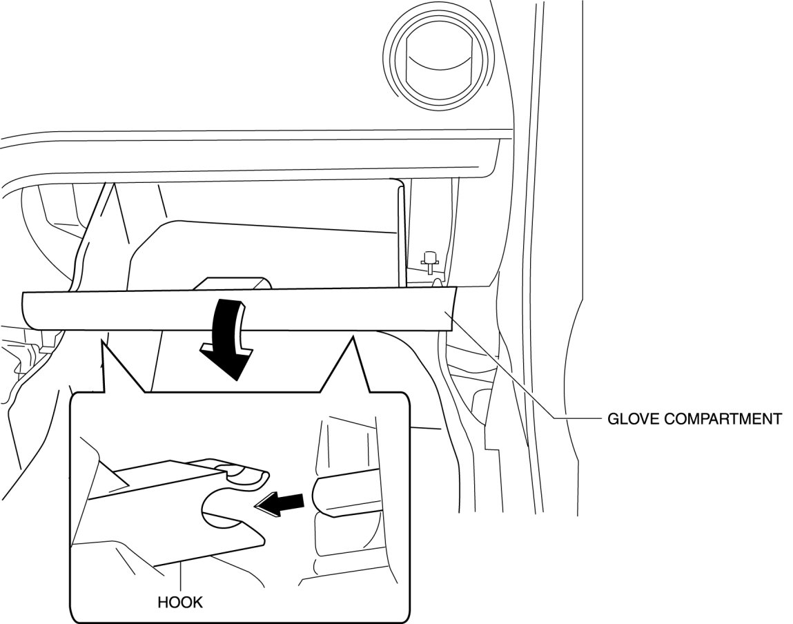 4. Detach the hook from the dashboard in the direction of the arrow shown in the figure and remove the glove compartment.
