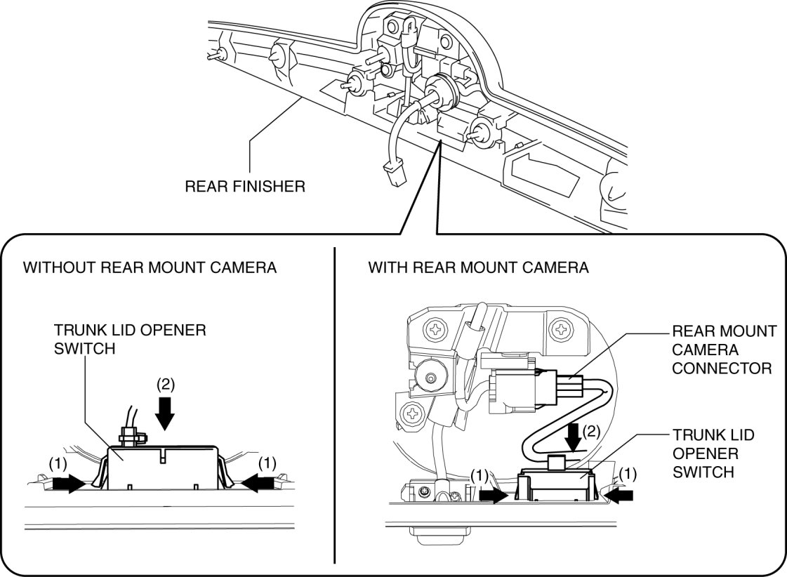 4. Remove the trunk lid opener switch in the direction of the arrow (2) shown in the figure while pressing the trunk lid opener switch tabs in the direction of the arrow (1).