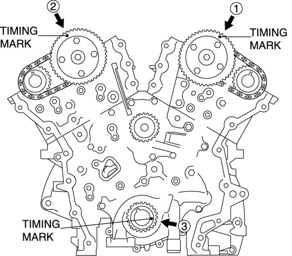 1. Align the alignment marks on the camshaft timing chain and both intake and exhaust side camshaft sprockets of both banks.