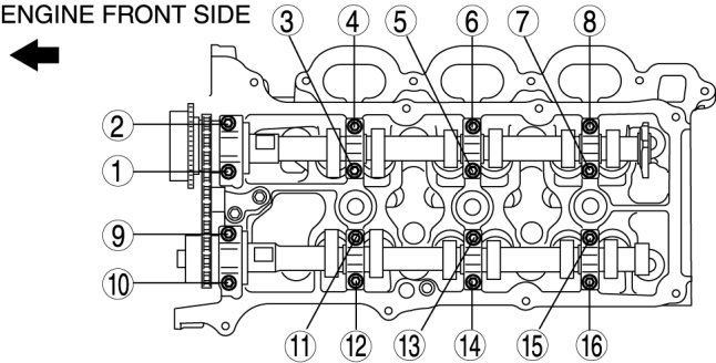Install the RH bank camshaft caps and temporarily tighten the camshaft cap bolts evenly in the order shown in several passes.