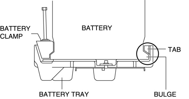 1. Install the battery clamp with the lower bulge of the battery set against the battery tray tab.