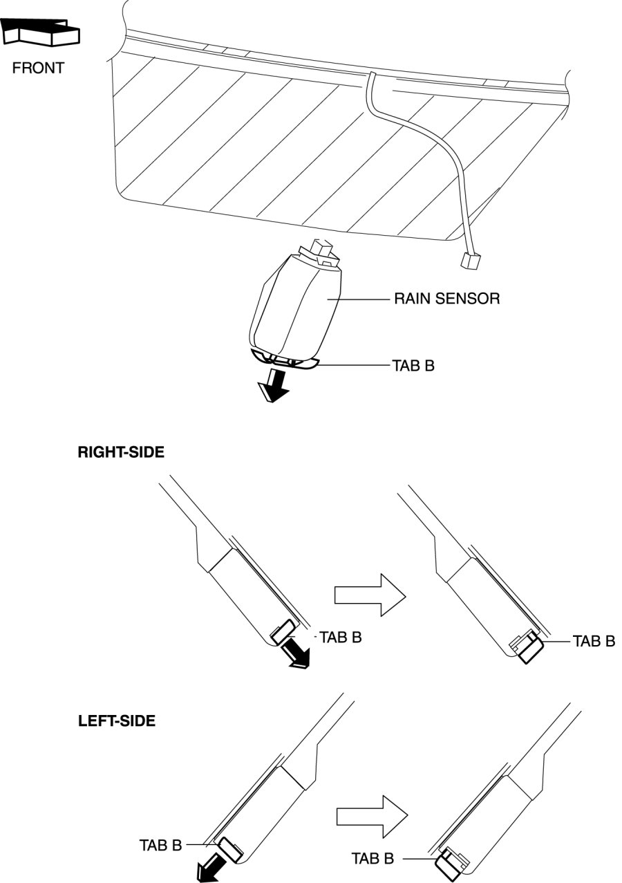 4. Slide rain sensor tab B in the direction of the arrow shown in the figure and detach tab B.