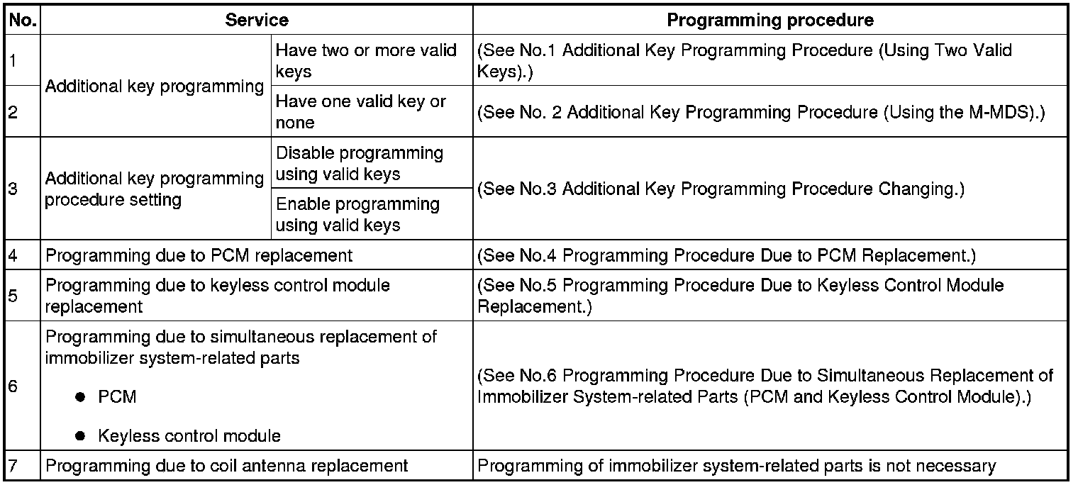 Immobilizer System-Related Parts Service and Programming Procedure Table