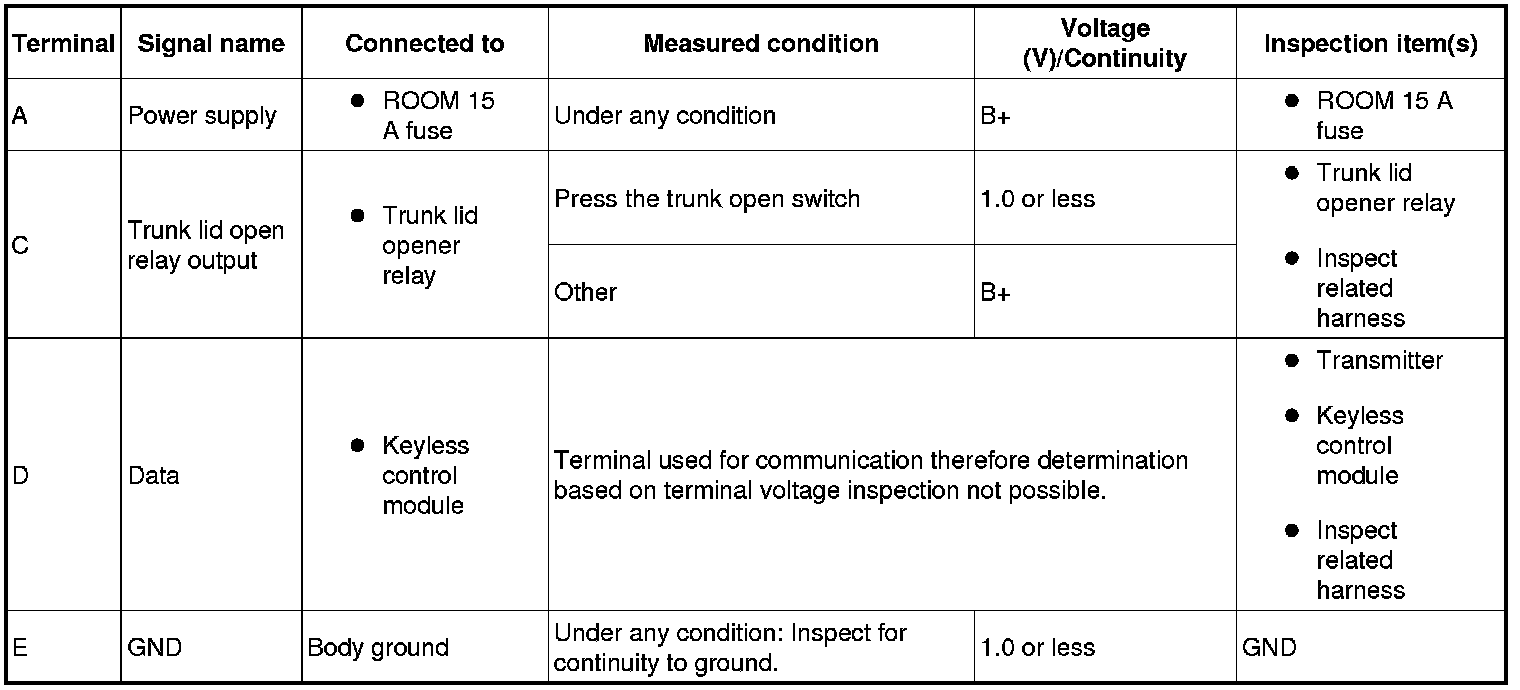 1. Measure the voltage or inspect for continuity according to the Terminal Voltage Table (Reference).