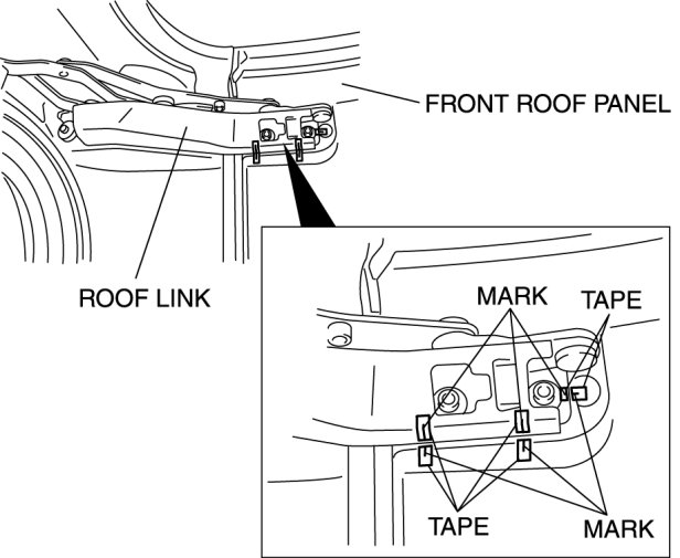 6. When removing the front roof panel, place the positioning mark by affixing masking tape on the roof link and front roof panel.
