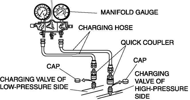 2. Connect the charging hoses to the high/low pressure side joints of the manifold gauge.