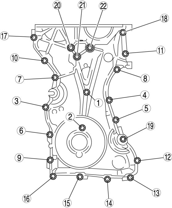 Install the engine front cover bolts in the order as shown.