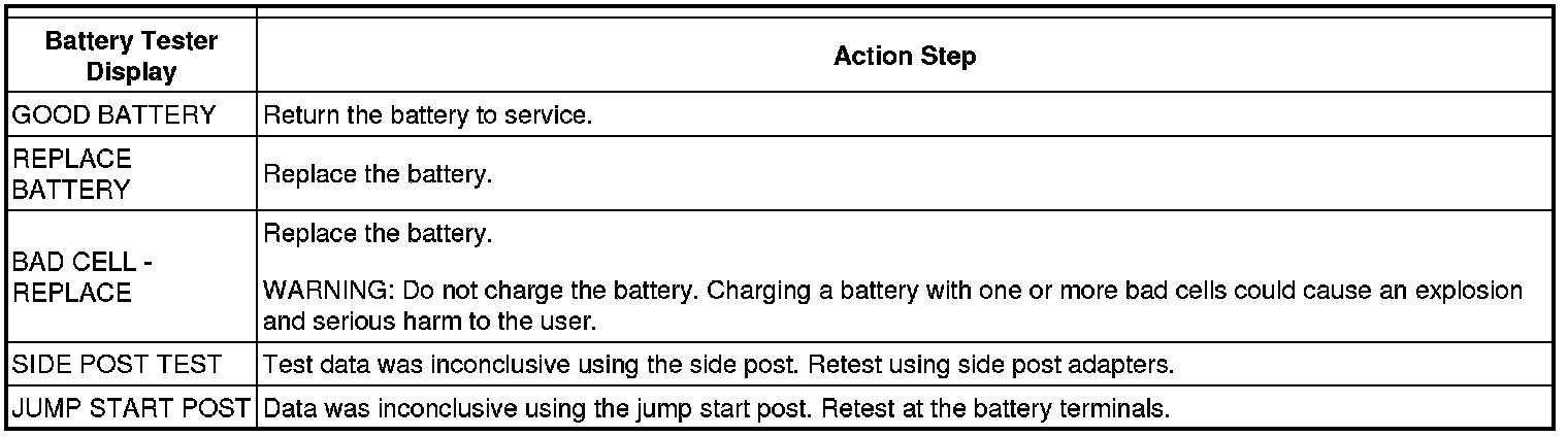 6. After the charge session is complete, the Mazda GR8-1291 will print out the Diagnostic Charging results and display one of the following results listed below. Review the results and follow the Action Step for the displayed result.