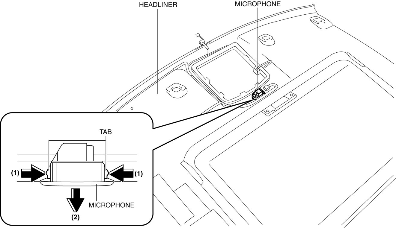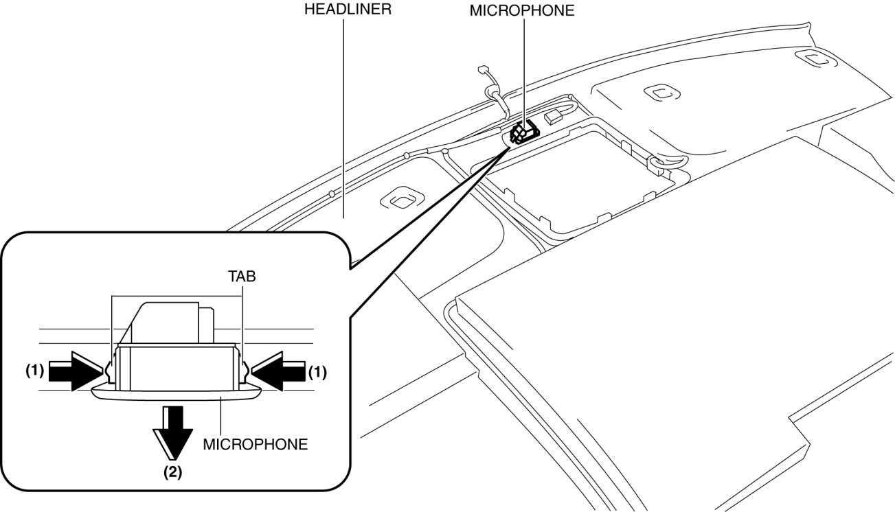 4. Remove the microphone in the direction of the arrow (2) shown in the figure while pressing the microphone tabs in the direction of the arrow (1).