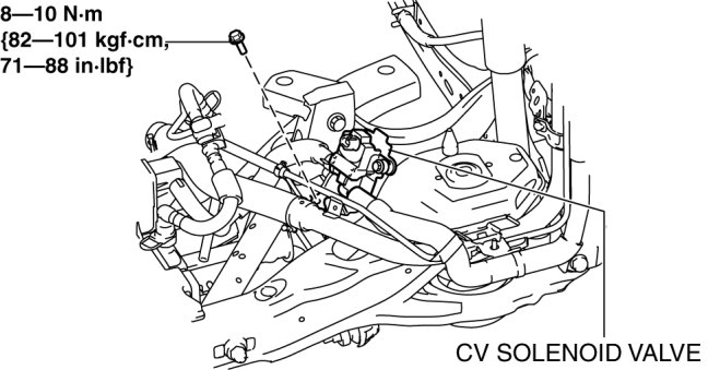 4. Remove the CV solenoid valve from the rear crossmember. (MZR 2.0 (Except Mexico), SKYACTIV-G 2.0, MZR 2.3 DISI Turbo, MZR 2.5 (Except Mexico))