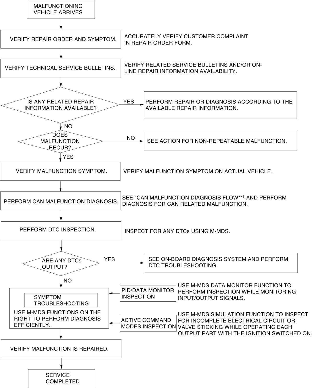 - If there is any vehicle malfunction complaint lodged by a customer, perform malfunction diagnosis according to the troubleshooting procedure.