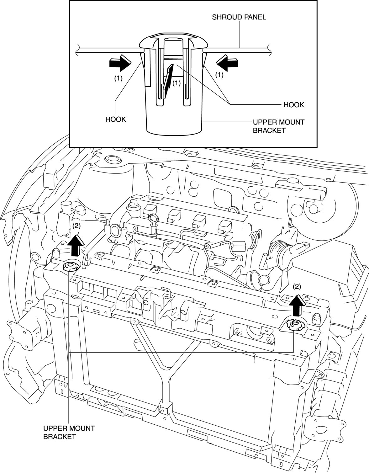 5. Push the hooks in the direction of arrow (1), and remove the upper mount bracket in the direction of the arrow (2).