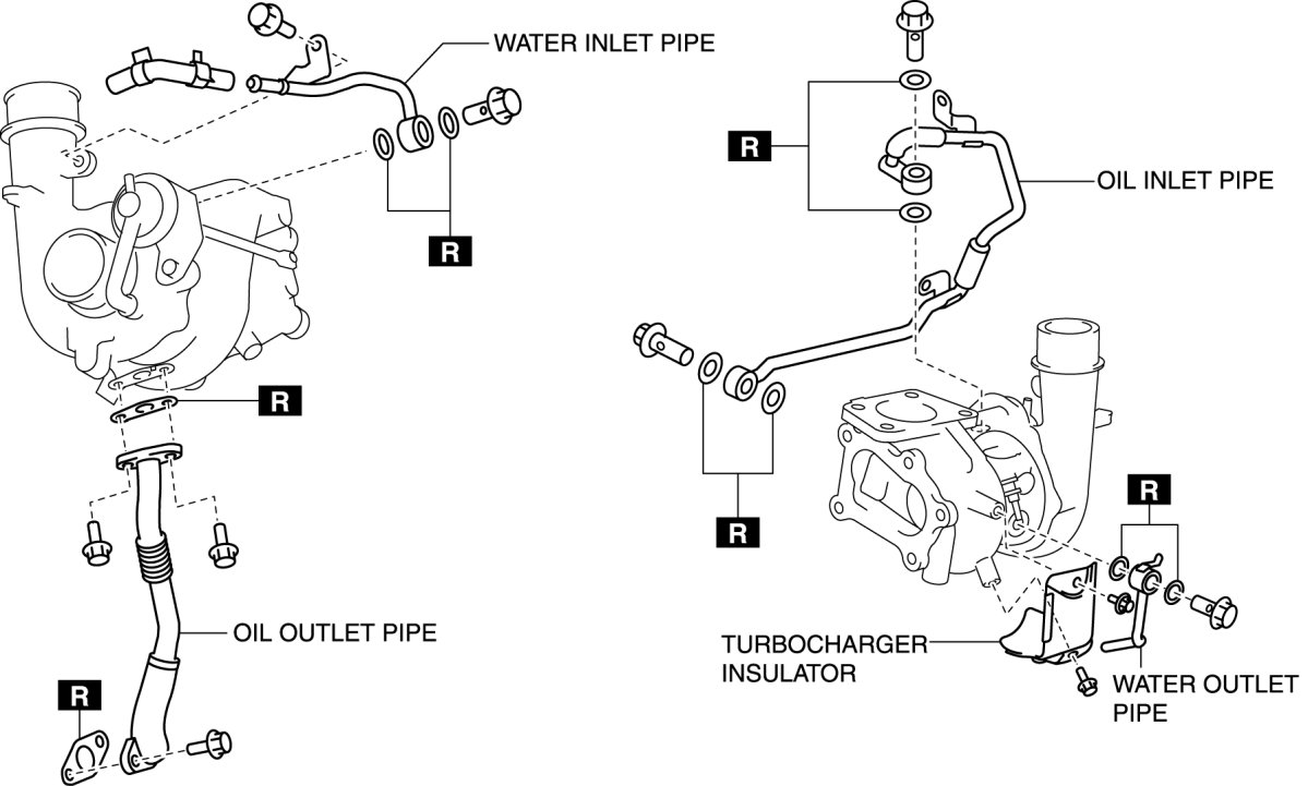 7. Remove the oil outlet pipe, oil inlet pipe, water pipe, and turbocharger insulator.