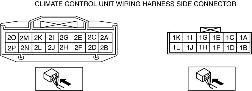 4. By inserting the positive (+) lead of the tester into the climate control unit connector, measure the voltage according to the terminal voltage table.