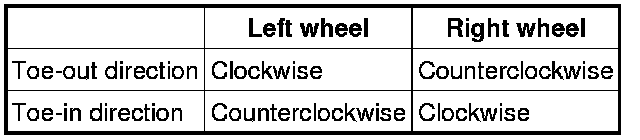 Each tie rod has a right-hand thread. When increasing the toe-in angle, rotate the right tie rod toward the front of the vehicle and rotate the left tie rod toward the rear of the vehicle by the same amount.